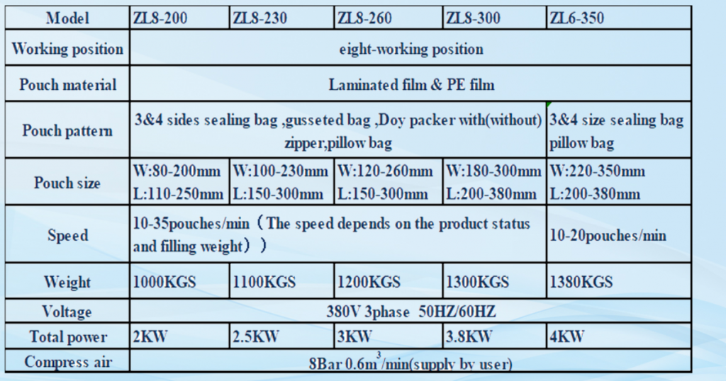 - इस मशीन की गति सीमा के साथ आवृत्ति रूपांतरण द्वारा समायोजित की जाती है, और वास्तविक गति उत्पादों और पाउच के प्रकार पर निर्भर करती है