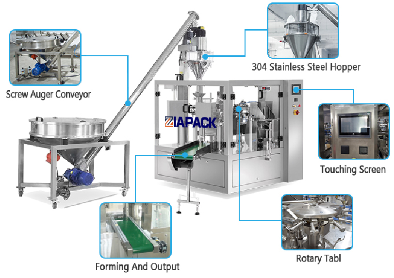 ऑगुर फिलर और स्क्रू लिफ्ट के साथ सुसज्जित, यह व्यापक रूप से पैकिंग पाउडर, जैसे डिटर्जेंट पाउडर, दूध पाउडर, आटा, मसाला, कोको पाउडर, ग्राउंड कॉफी, आदि पर लागू होता है।